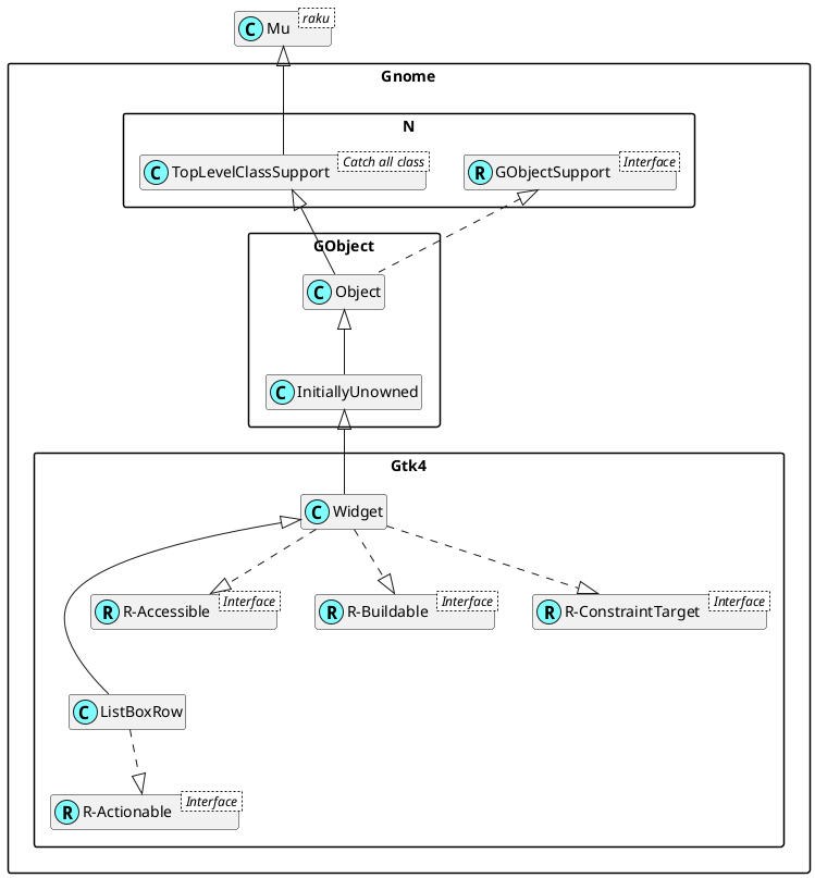 Gnome::Gtk4::ListBoxRow is the kind of widget that can be added to a Gnome::Gtk4::ListBox.